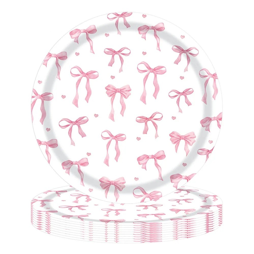 10 ks Papierové party taniere 22,9 cm Ružové mašličky a srdiečka Jednorazové narodeninové taniere na torty dezerty a občerstvenie