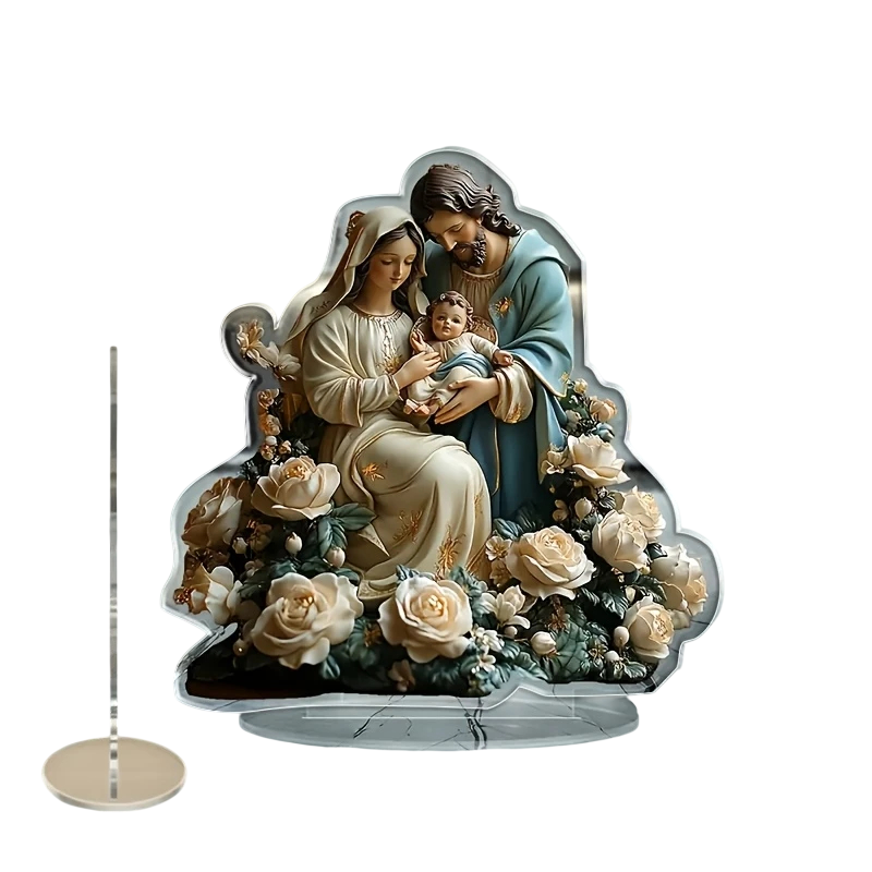2D akrylová vianočná dekorácia na stôl 16 x 15 x 0,2 cm Ježišovo narodenie kreslený print Panna Mária a Svätý Jozef Darčeková ozdoba Biele ruže