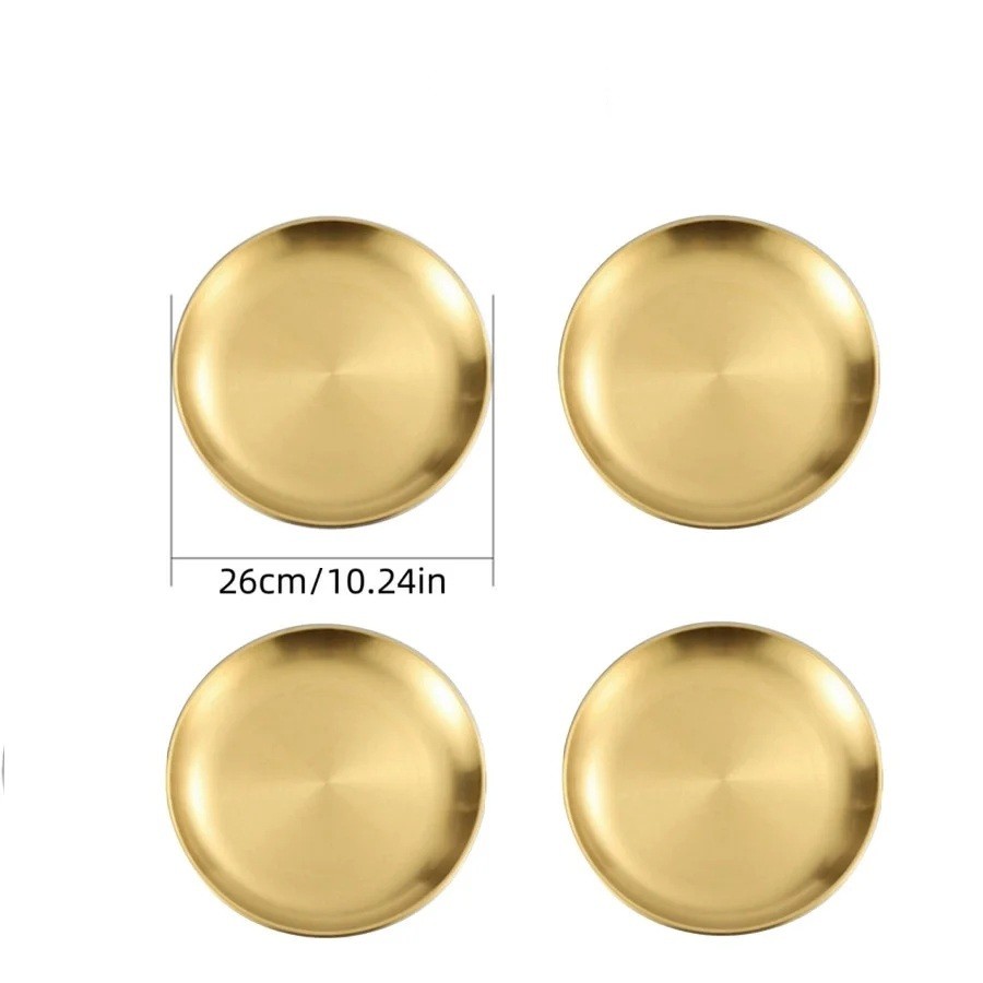 Úvodná strana Úvodná strana Dom a domáce potreby Do kuchyne Stolovanie Taniere 4 ks tanierov z nehrdzavejúcej ocele 26 cm Zlaté kuchynské taniere elegantné servírovanie hlavných jedál slávnostné aj každodenné použitie