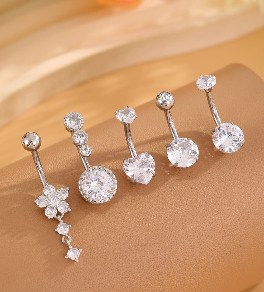 5 ks piercingov z nehrdzavejúcej ocele Strieborný set s diamantmi Srdiečka a kvietky Jemne zdobené šperky pre každodenné nosenie
