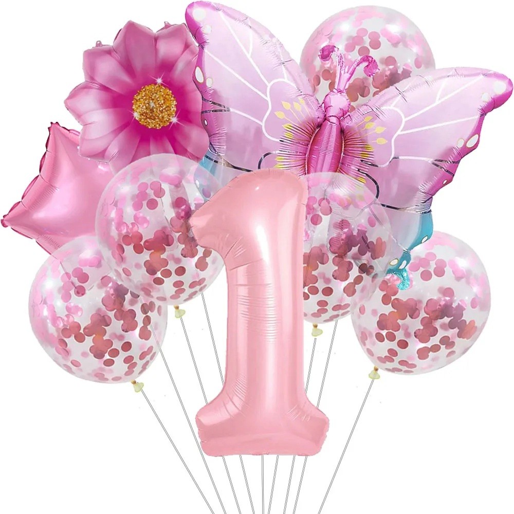 9 ks Narozeninové balónky číslo 1 Motýľ kvetina Konfety Latexové a fóliové balónky Party dekorácie na prvé narodeniny detská oslava