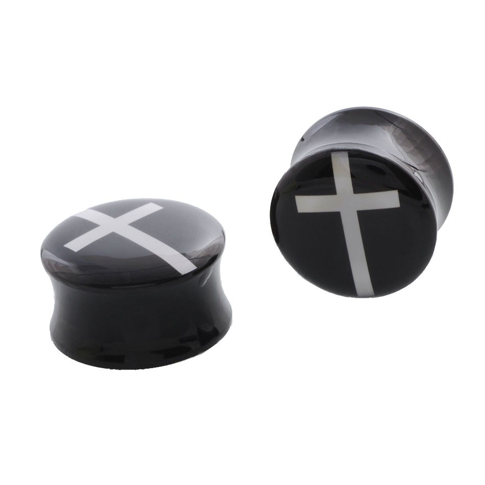 Elegantný, čierny a kvalitné plug z akrylátu s bielym krížikom.