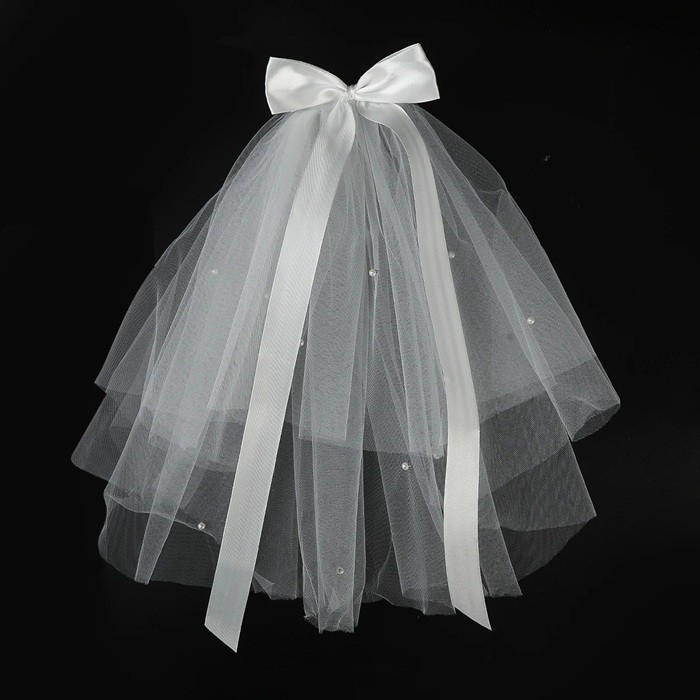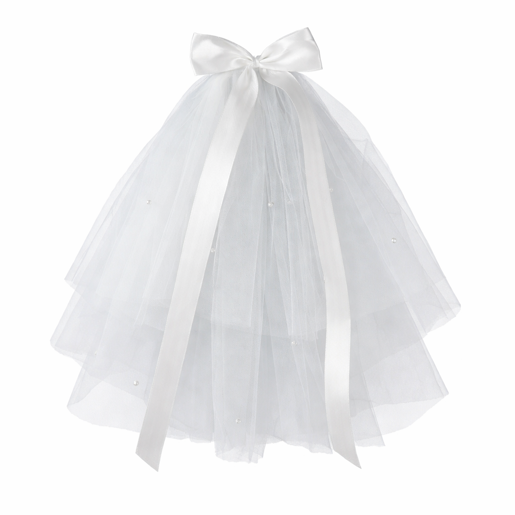 Elegantný biely tylový závoj zdobený jemnou mašľou a drobnými perličkami pôsobí romanticky a slávnostne. Vzdušný tyl krásne splýva a dodáva účesu ľahkosť.