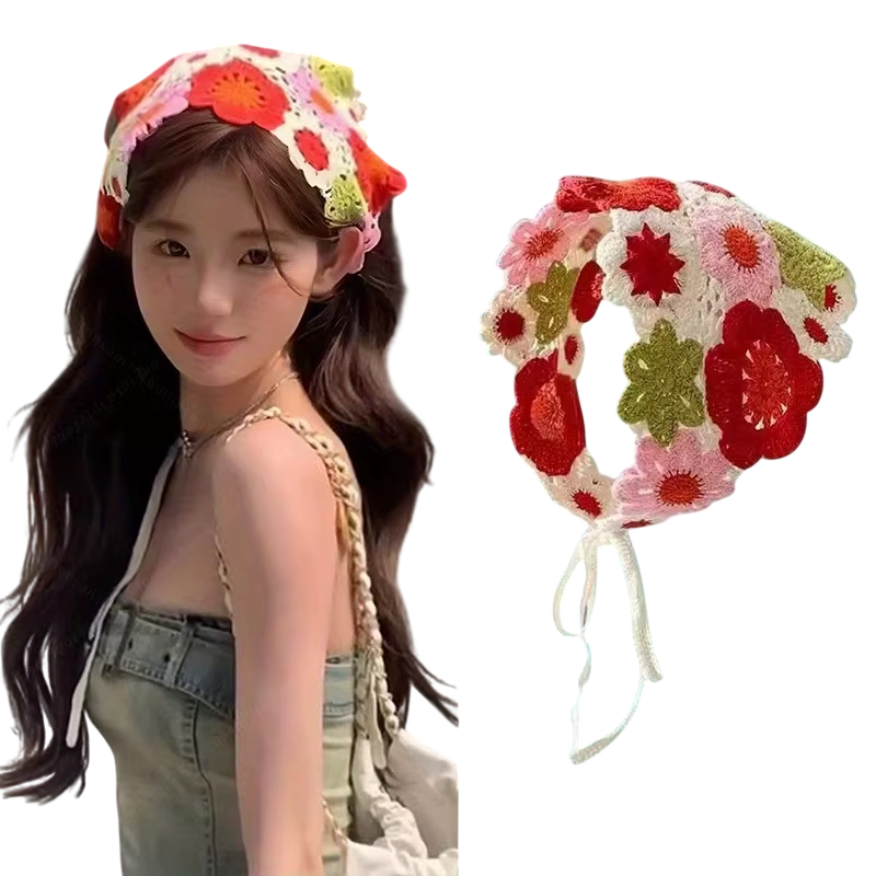 Boho háčkovaný trojúhelníkový šátek Kvetinový dizajn Jarný letný vlasový šátek pre ženy Ľahká roztomilá pokrývka hlavy na cestovanie