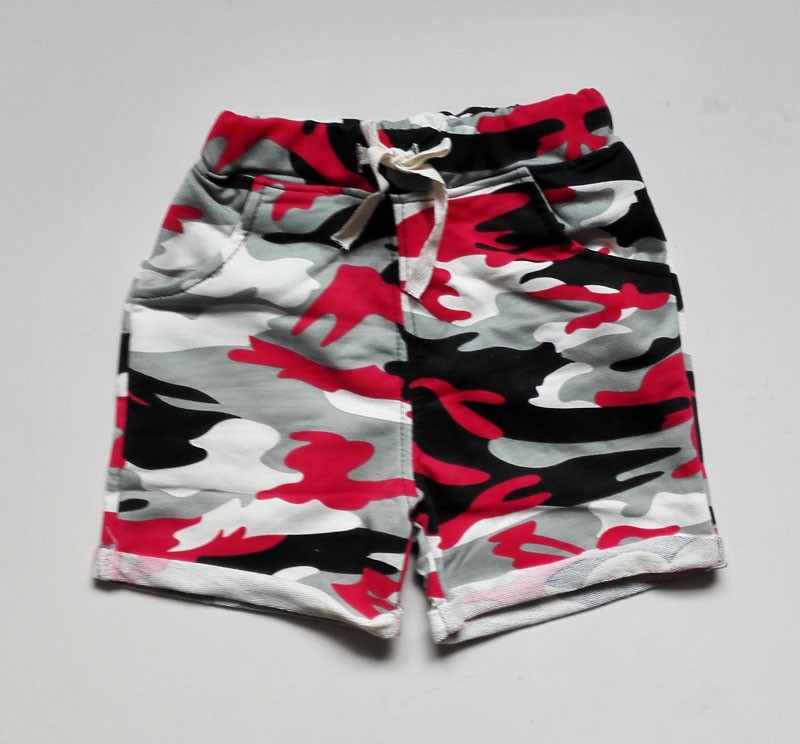 Krásne chlapčenské šortky so vzorom kamufláže v rôznych farbách.