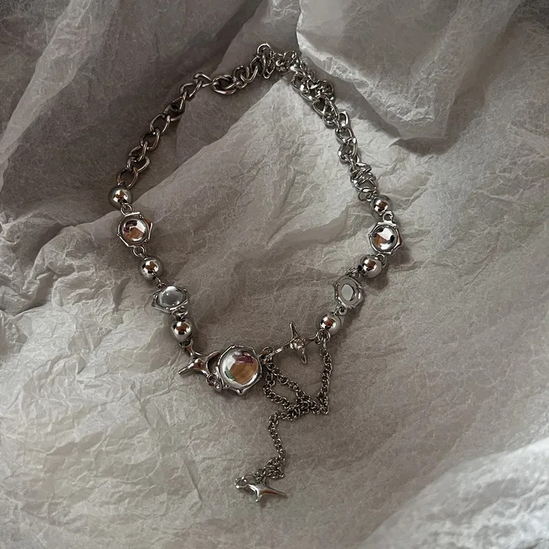 Moderný choker z chirurgickej ocele kombinujúci motív štvorcípých hviezd a korálov pre originálny vzhľad a jednoduché každodenné nosenie. Celý popis