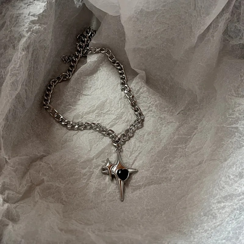Tento dámsky choker z chirurgickej ocele je výrazným a elegantným doplnkom, ktorý zaujme minimalistickým prevedením a dominantným detailom. Kvalitná chirurgická oceľ zaisťuje dlhú životnosť, vysokú odolnosť a pohodlné nosenie aj pre citlivejšiu pokožku. Hlavným prvkom náhrdelníka je prívesok v tvare štvorcípé hviezdy, ktorý pôsobí moderne a symbolicky. Prívesok zdobí výrazný čierny zirkón, ktorý dodáva šperku hĺbku, kontrast a luxusný vzhľad. Choker je navrhnutý tak, aby prirodzene obopínal krk a stal sa nepřehladnuteľným, ale stále vkusným doplnkom.