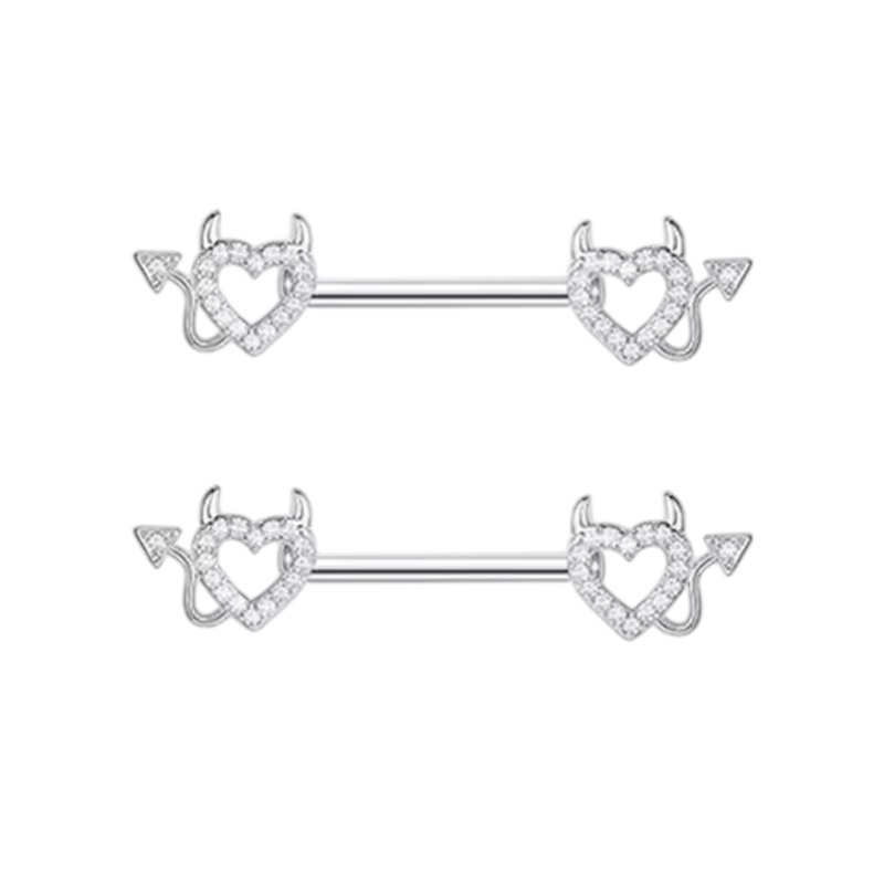 Tento výrazný pár telových šperkov je navrhnutý pre ženy a dievčatá, ktoré sa neboja vystúpiť z davu a dať svojmu vzhľadu osobitý charakter. Vďaka štandardnej veľkosti 1,6 mm je vhodný pre bežné piercingy do bradaviek a umožňuje pohodlné a stabilné nosenie. Lesklé prevedenie dodáva šperkom výrazný vizuálny efekt, ktorý pôsobí atraktívne a sebeisto. Motív srdca s ďábelskými prvkami kombinuje romantiku s rebelským nádychom a vytvára originálny kontrast, ktorý priťahuje pozornosť. Tento telový piercing do bradaviek je ideálnou voľbou pre ženy, ktoré chcú vyjadriť svoju individualitu a odvážny štýl.