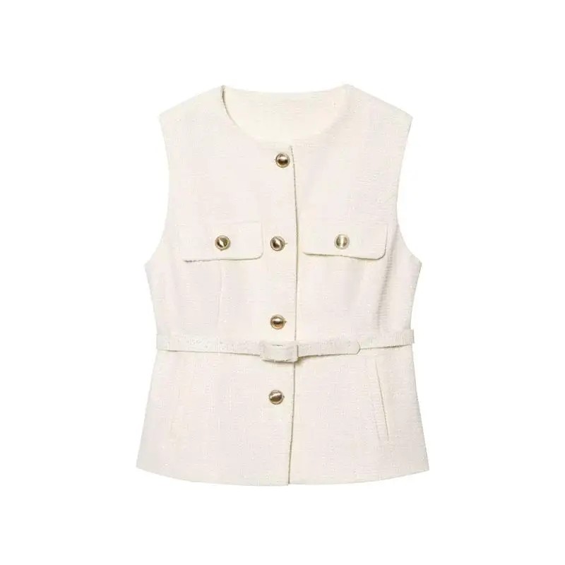 Stylová dámska vesta s pásikom v páse a vreckami na prsiach. Elegantný strih s výstrihom do O a zapínaním na gombíky pre moderný vzhľad. Celý popis