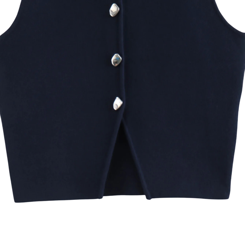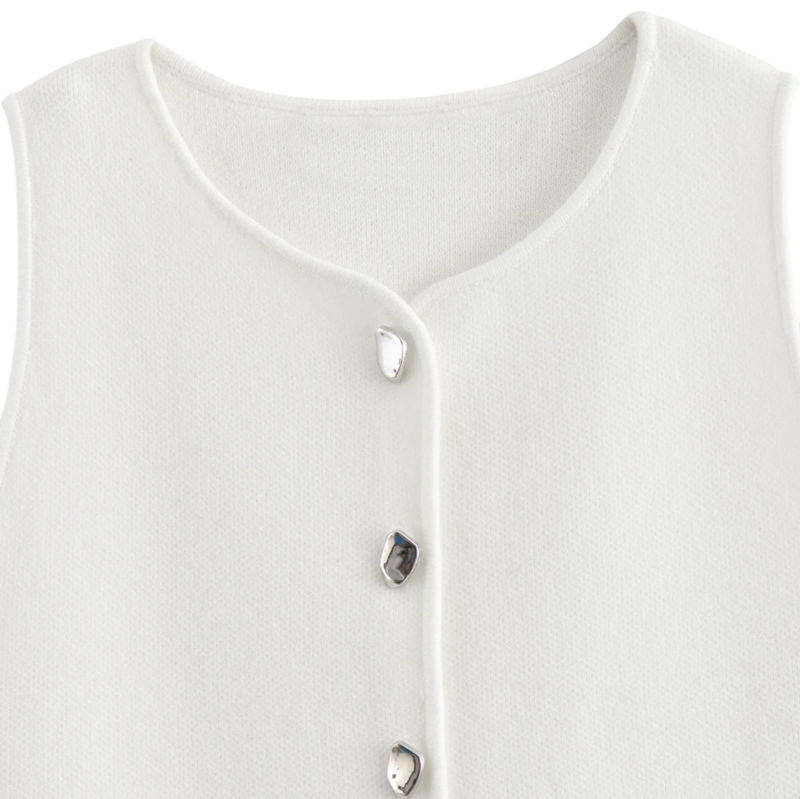 Štýlová dámska vesta s výstrihom do O a zapínaním na gombíky. Ľahký polyesterový materiál a vrecká na prsiach pre elegantný vzhľad. Celý popis