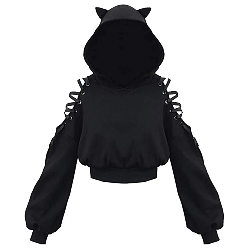Dámska mikina s kapucňou s mačacími ušami Čierna mikina so šnurovaním na ramenách Bavlneno-polyesterový pohodlný voľnočasový vrch