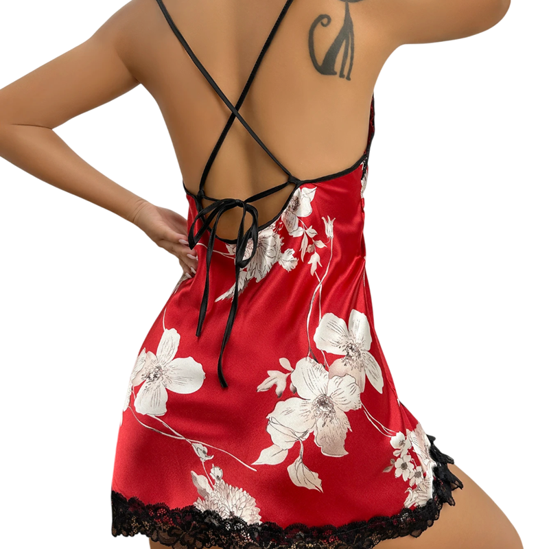 Elegantná dámska nočná košela z ľahkého polyesteru s kvetinovým vzorom, čipkovým lemom, výstrihom do V a rozparkom pre pohodlie aj štýl. Celý popis