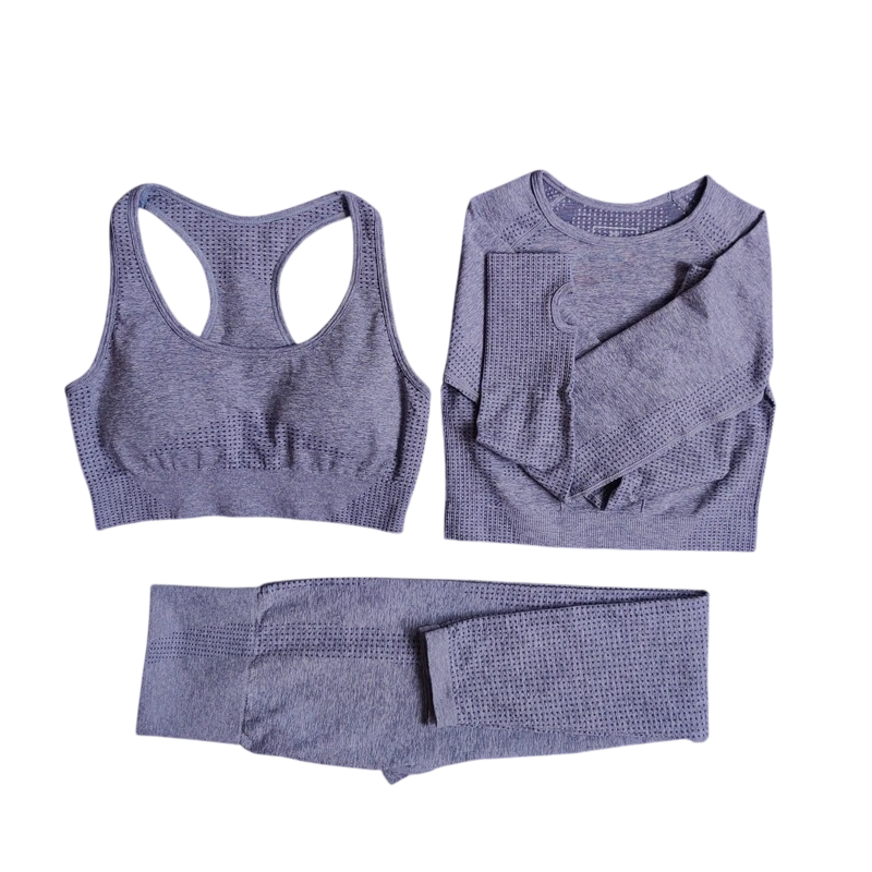 Táto dámska športová súprava je navrhnutá pre ženy, ktoré chcú funkčný, pohodlný a štýlový outfit pre aktívny životný štýl. Set zložený zo športovej podprsenky, trička s dlhým rukávom a legín poskytuje komplexné riešenie pre šport aj voľnočasové nosenie. Materiálová kombinácia nylonu, polyesteru a spandexu zaisťuje pružnosť, priedušnosť a príjemný pocit na pokožke. Jednofarebné prevedenie pôsobí moderne, čisto a ľahko sa kombinuje s ďalšími športovými doplnkami.