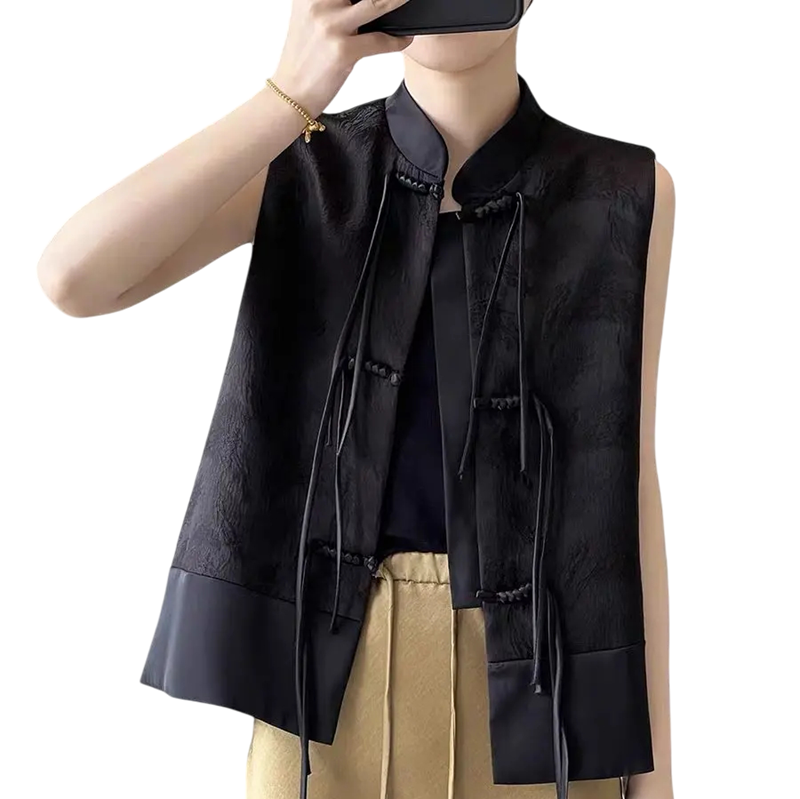 Štýlová dámska žakárová vesta bez rukávov s límcom. Kombinácia bavlny a polyesteru pre pohodlie, eleganciu a nadčasový vzhľad v rôznych farbách. Celý popis