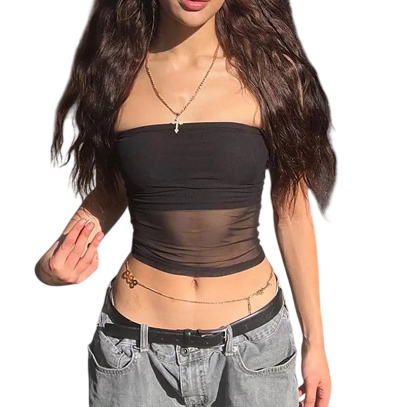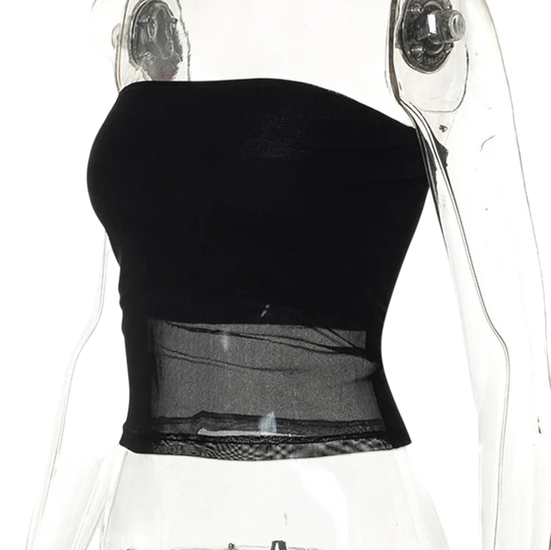 Štýlový polopriehľadný top bez ramienok v čiernej farbe je ideálny pre večerný outfit aj vrstvenie. Ľahký materiál dodáva elegantný vzhľad. Celý popis