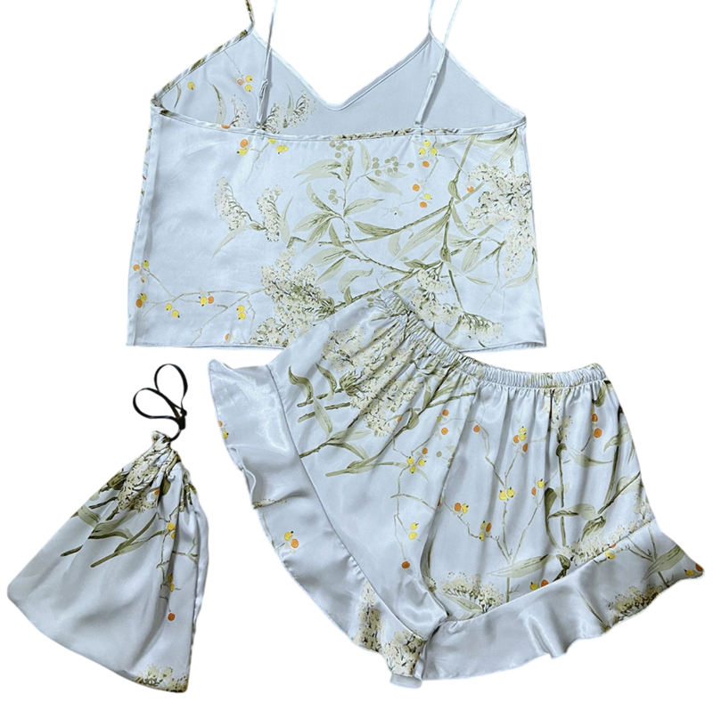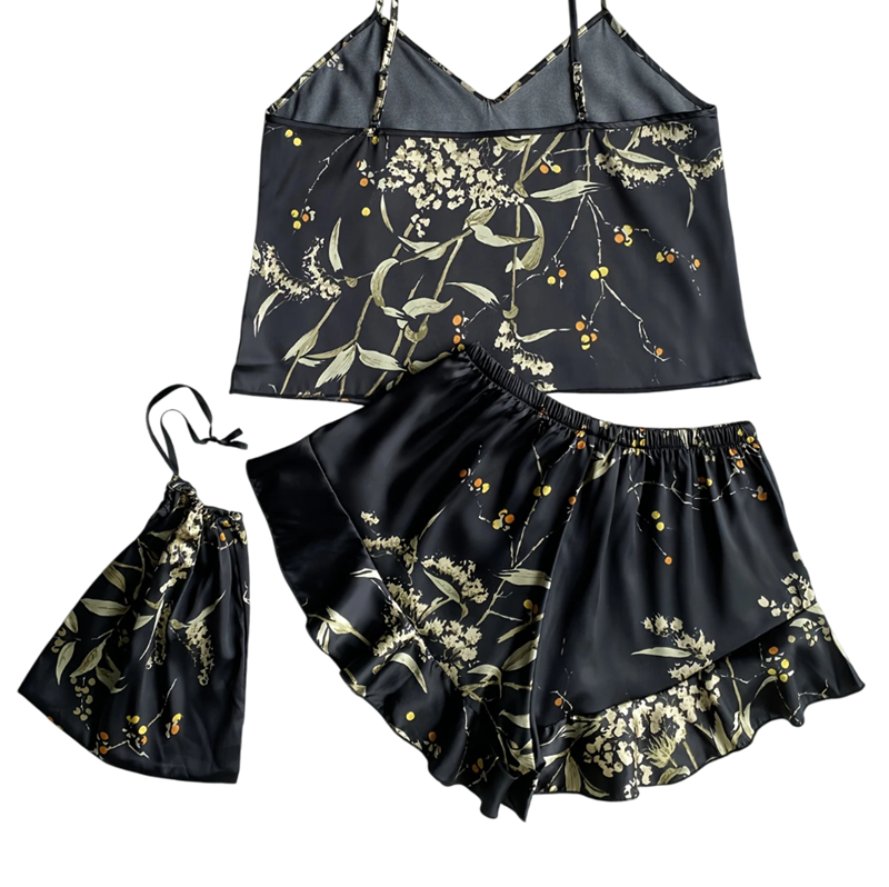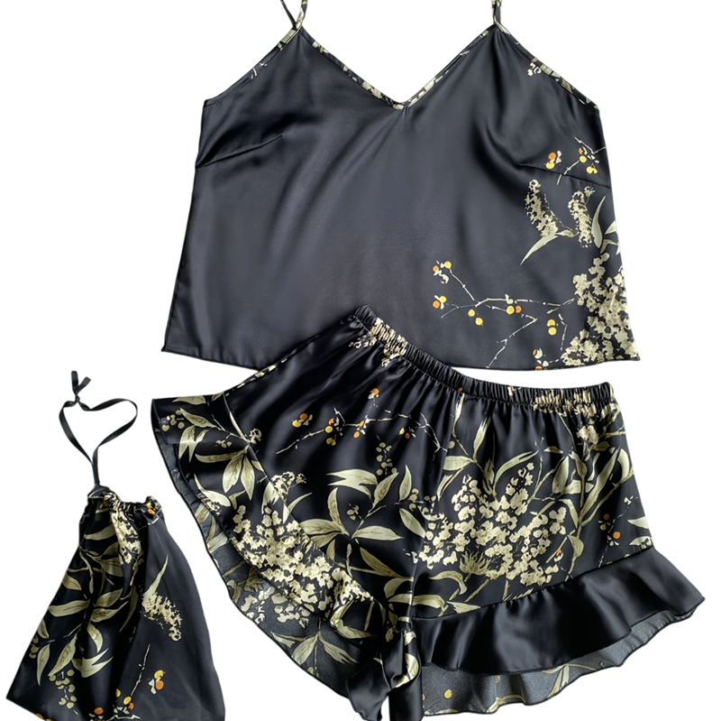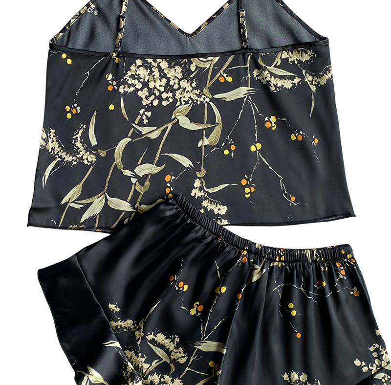 Horný diel tvorí tílko s výstrihom do V, ktoré pôsobí žensky a elegantne, zatiaľ čo kraťasy s elastickým pásom ponúkajú voľnosť pohybu a maximálne pohodlie. Kvetinový motív dodáva celému kompletu romantický a svieži nádych, vďaka ktorému sa budete cítiť pohodlne a štýlovo zároveň. Pyžamo je dostupné v rôznych farbách, ktoré umožnia zvoliť variantu podľa vášho vkusu.