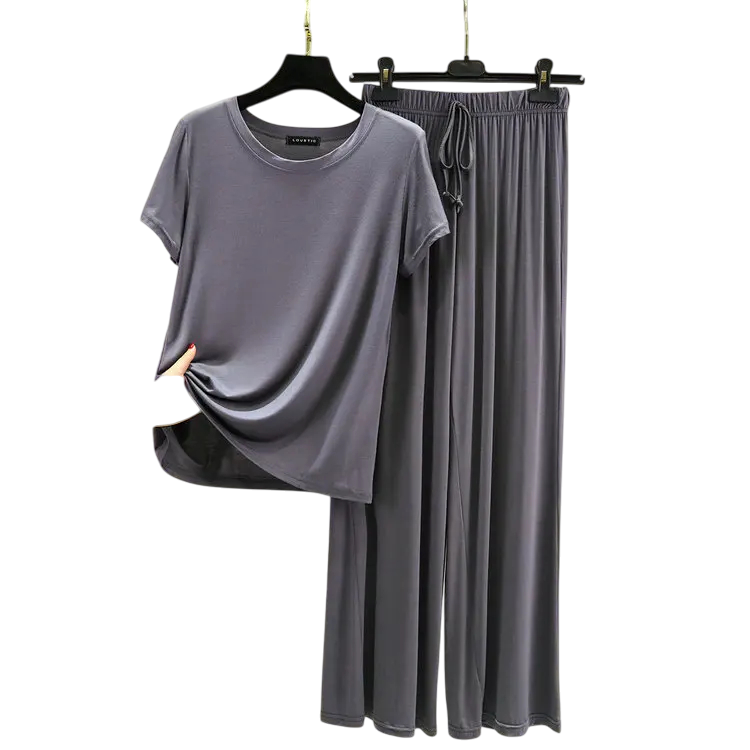 Toto elegantné dámske pyžamo predstavuje ideálnu kombináciu komfortu, kvality a štýlu. Vyrobené z mäkkého modalu s prímesou spandexu, ponúka výnimočnú pružnosť a prirodzenú priedušnosť. Materiál je jemný, ľahký a skvele odvádza vlhkosť, čo zaručuje pohodlie aj počas teplých nocí. Krátke rukávy a výstrih do O dodávajú hornému dielu jednoduchý, ale ženský vzhľad, zatiaľ čo dlhé nohavice poskytujú pocit pohodlia a voľnosti. Tento komplet sa perfektne hodí pre každodenné nosenie aj pokojné večery doma.