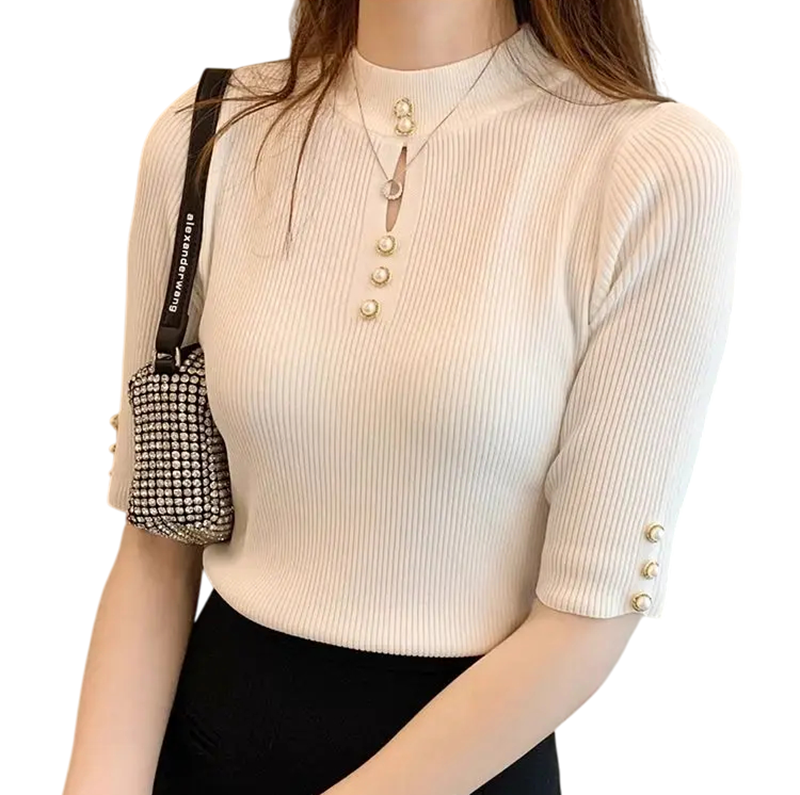 Tento dámsky sveter s polovičnými rukávmi predstavuje dokonalú kombináciu elegancie a pohodlia. Vyrobený z mäkkej zmesi akrylu a bavlny, ponúka príjemný pocit pri nosení a zachováva si svoj tvar aj po niekoľkých praní. Jednobarevný dizajn s jemným prostrihom na hrudi dodáva outfitu decentný, ale pritom ženský vzhľad. Univerzálna veľkosť a ľahký materiál zaručujú, že sa sveter skvele prispôsobí postave a bude vhodný ako do práce, tak aj pre voľnočasové aktivity.