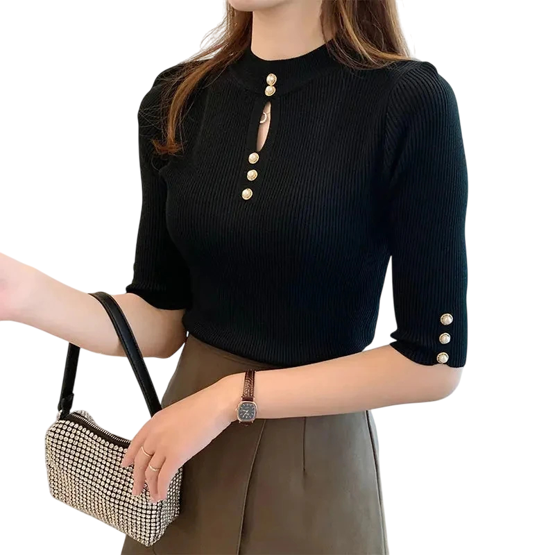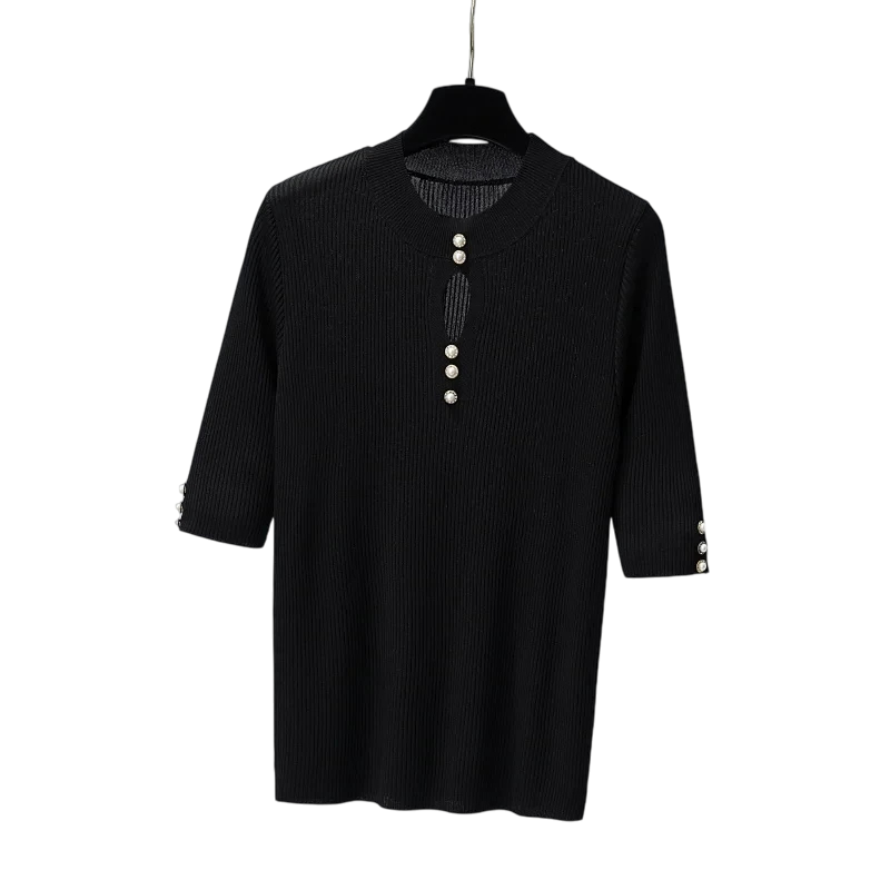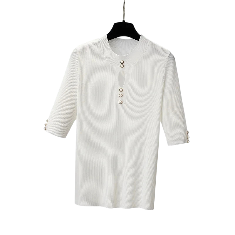 Dámsky pletený sveter s polovičnými rukávmi a výstrihom do O Jemný prostřih na hrudi Jednobarevný top z akrylu a bavlny Elegantný štýl