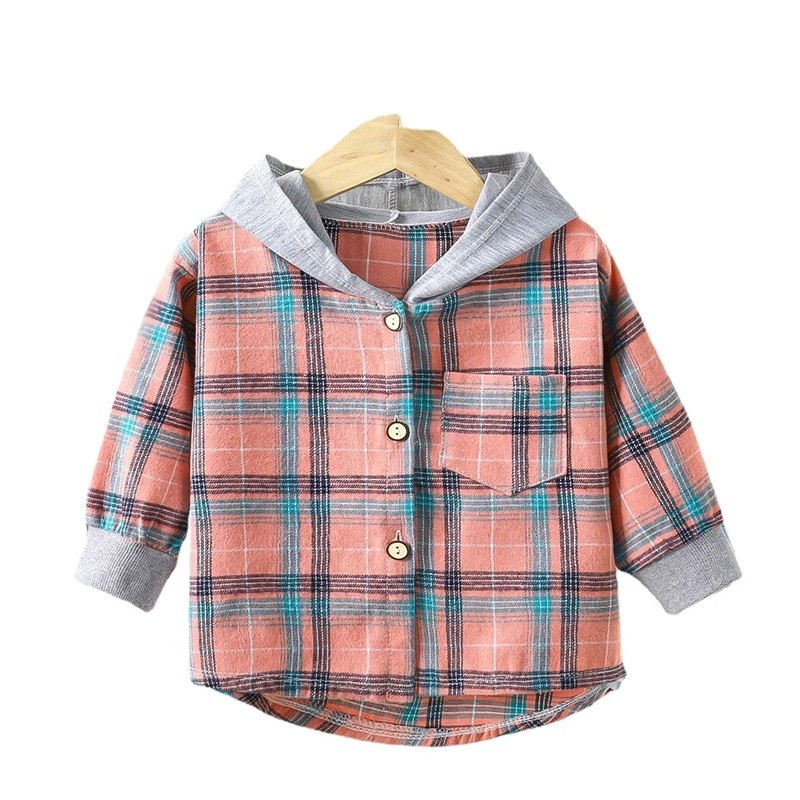 Detská kostkovaná košela s kapucňou Bavlna Polyester Dívčí a chlapecký kabátik na jar a jeseň Dlhý rukáv Štýlová bunda na gombíky