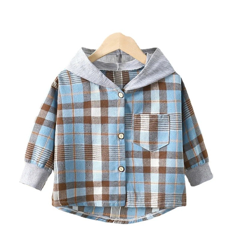 Detská kostkovaná košela s kapucňou Modrohnedá Bavlna Polyester Dievčenský a chlapčenský kabátik na jar a jeseň Štýlová bunda s dlhým rukávom a gombíkmi