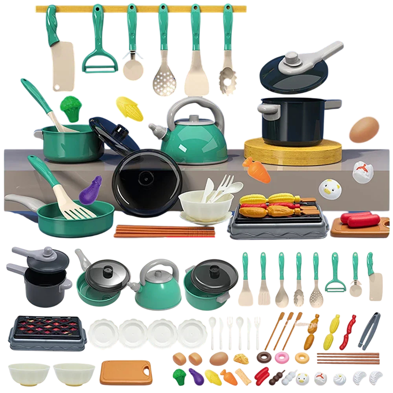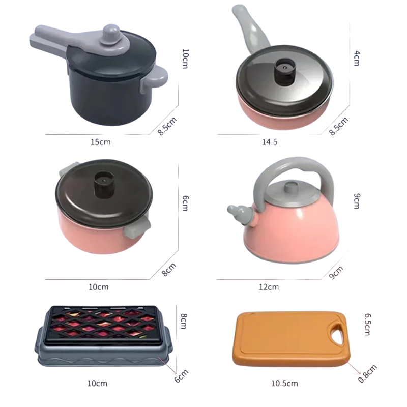 Součástí setu sú panvičky, hrnce, príbory, tanieriky, prkénko, kanvica, misky, zelenina a ďalšie doplnky, ktoré zaručujú realistický zážitok z varenia. Deti si môžu vyskúšať, aké je to variť, smažiť, miešať alebo servírovať jedlo, a zároveň sa učia základným princípom stolovania a hygieny. Hračka je skvelým nástrojom na rozvoj fantázie a koordinácie pohybov.