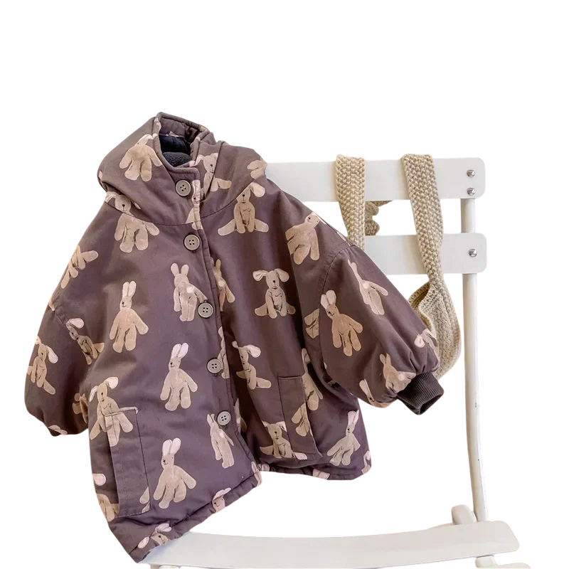 Teplá detská zimná bunda s roztomilými motívmi králikov, kapucňou, vreckami a zapínaním na gombíky. Bavlnený materiál zabezpečuje mäkkosť, pohodlie a hrejivosť. Celý popis