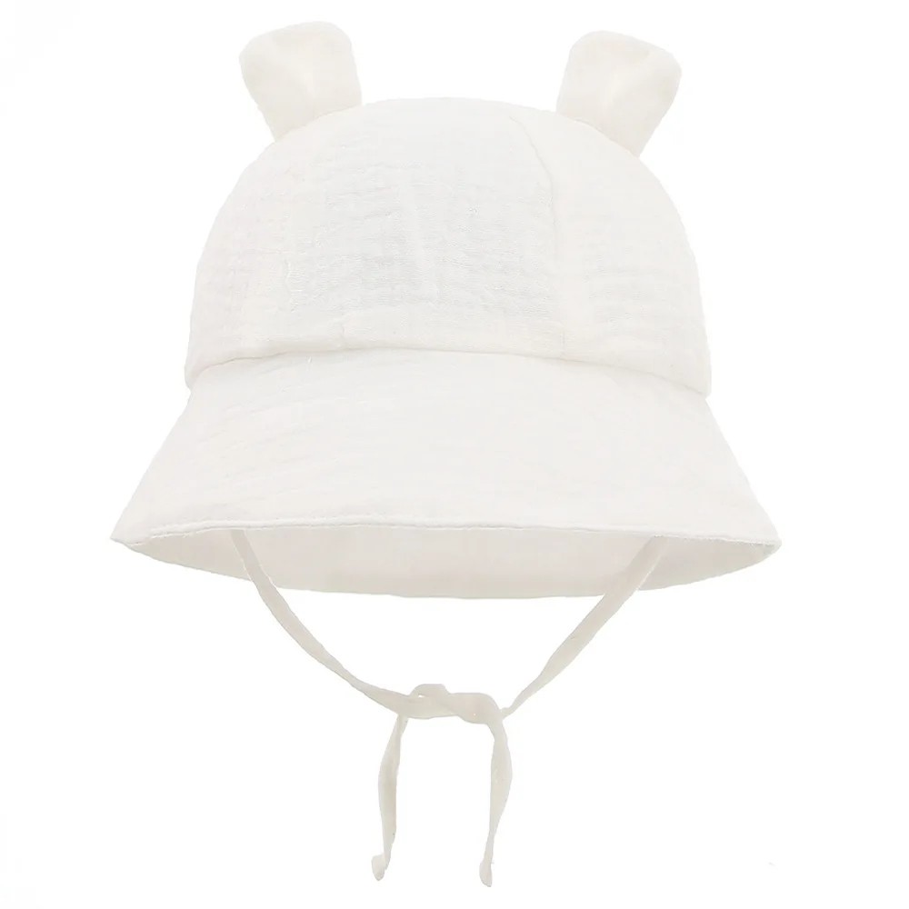 Roztomilý bavlnený klobúčik s ušami chráni hlavičku bábätka pred slnkom, dobre drží vďaka zaväzovaniu a je ideálny na vonkajšie nosenie Celý popis