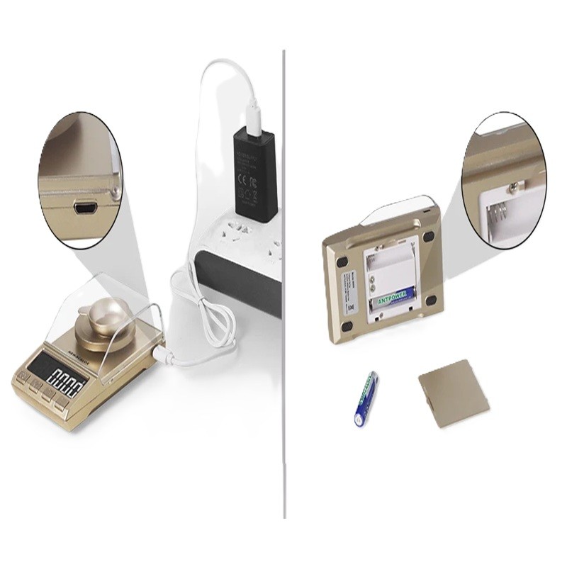 Digitálna váha na šperky do 50 g presnosť 0,001 g USB napájanie alebo 3× AAA Prepínanie jednotiek tl dwt gn ozt oz ct mg g Automatické vypnutie