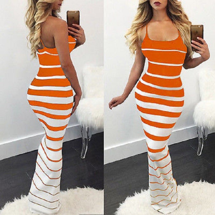 Dlhé dámske šaty na tenkých ramienkach.