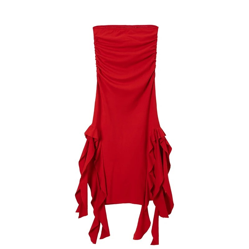 Úvodná strana Úvodná strana Oblečenie a doplnky Dámske Dámske šaty Dámske maxi šaty Dlhé večerné šaty bez ramienok s asymetrickým volánovým lemom a vysokými rázporkami Elegantné priliehavé slávnostné šaty