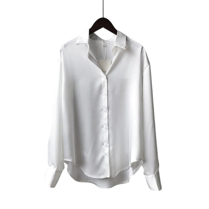 Úvodná strana Úvodná strana Oblečenie a doplnky Dámske Dámske košele Dámske voľnočasové košele Elegantná saténová dámska košela s límcom Voľný strih s gombíkmi Jednofarebná blúzka z polyesteru Štýlový top do práce aj na voľný čas