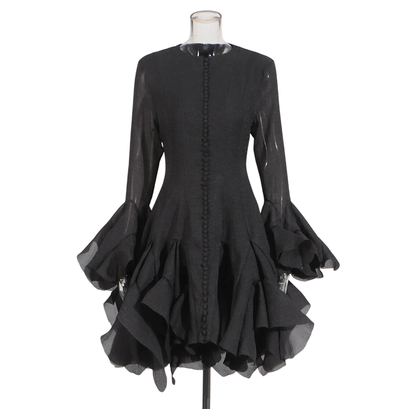 Koktejlové šaty s bohatou viacvrstvovou sukňou Volánové rukávy Elegantný strih Dlhé rukávy Zapínanie na gombíky Luxusný spoločenský model