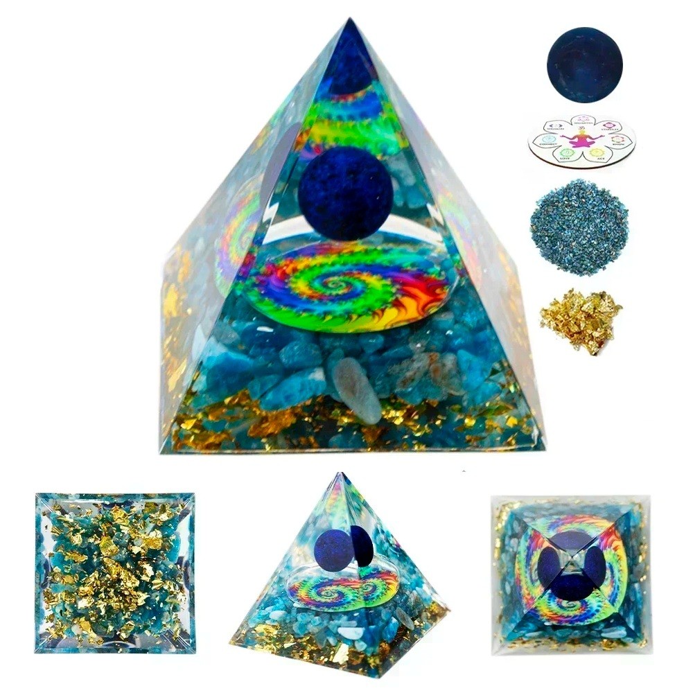 Táto výrazná energetická pyramída je tvorená kombináciou tyrkysovej minerálnej drviny, zlatých vločiek, čakrovej špirály a modrej kryštálovej gule. Tyrkys je známy svojimi očistnými a ochrannými účinkami, posilňuje vitalitu, znižuje stres a podporuje celkové zdravie. Modrá kryštálová guľa vo vrchole pyramídy symbolizuje pokoj, rozjímanie a prepojenie s vyšším vedomím. Spodná čakrová špirála potom pomáha vyrovnať vnútornú energiu a harmonizovať telo i myseľ.