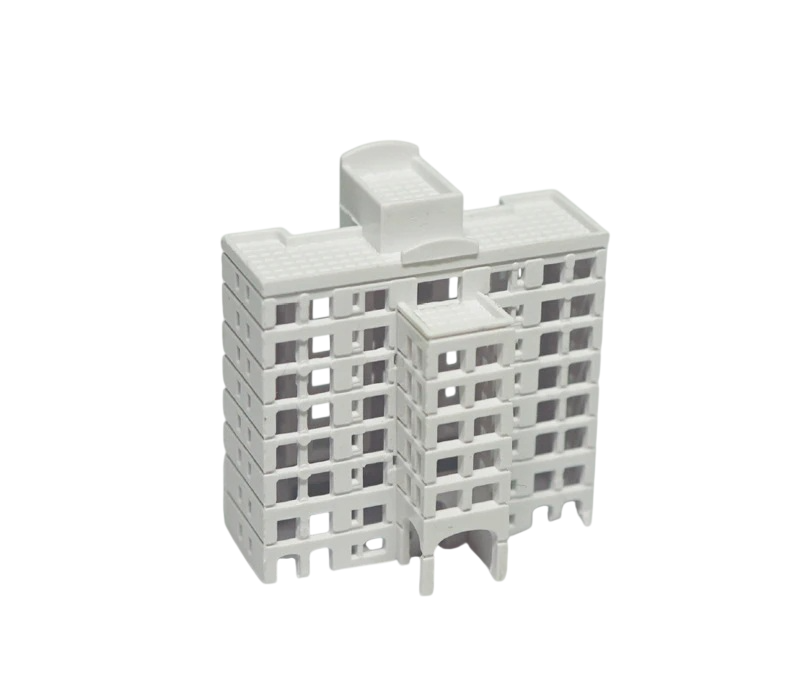 Doplňte svoju modelovú scénu realistickou budovou v mierke 1:500. Tento detailne spracovaný model bytového domu je ideálny pre architektonické dioráma, urbanistické návrhy aj kreatívne projekty. Vďaka prepracovaným okenným otvorom a balkónovým prvkom pôsobí budova dôveryhodne a prirodzene zapadne do mestskej zástavby. Biele prevedenie umožňuje aj individuálne úpravy podľa potreby.
