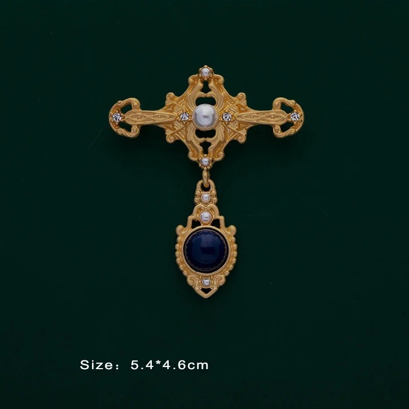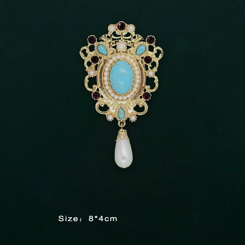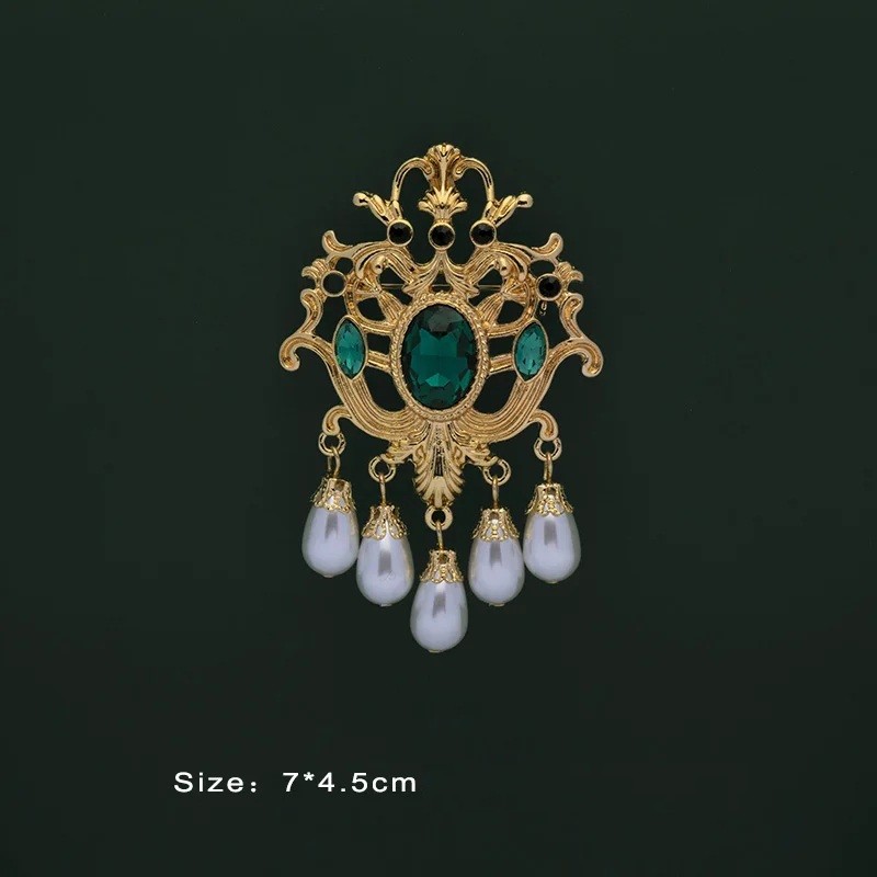 Táto módna kráľovská baroková brošňa zaujme bohatým zdobením a výrazným tvarom inšpirovaným historickým luxusom. Zlatavé prevedenie v kombinácii s farebnými kamienkami vytvára elegantný šperk, ktorý pôsobí honosne a nepřehladnuteľne. Vďaka zaujímavému tvaru sa brošňa stáva dominantným prvkom každého outfitu. Je vyrobená zo zinkovej zliatiny, ktorá umožňuje precízne spracovanie detailov. Skvele sa hodí k slávnostným šatám, saku aj elegantnému kabátu.