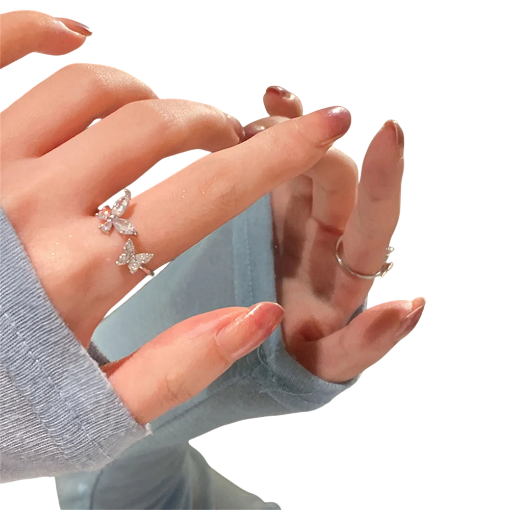 Jemný nastaviteľný prstienok s motýlikmi zdobenými trblietavými kamienkami dodá eleganciu každému outfitu. Pohodlné nosenie a univerzálna veľkosť. Celý popis