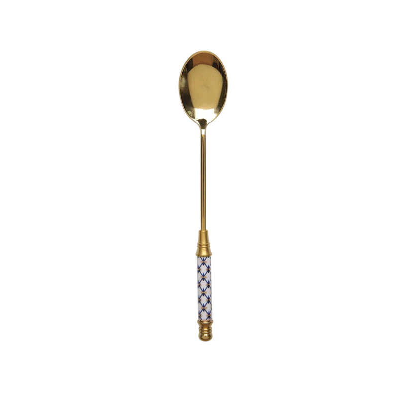 Elegantná dezertná lyžička je štýlovým doplnkom každej modernej kuchyne aj slávnostného stolovania. Kombinácia lesklého kovového povrchu a dekoratívnej rúčky dodáva lyžičke luxusný a originálny vzhľad. Lyžička má lesklý zlatý povrch a bielo-modrú rúčku s jemným geometrickým vzorom, ktorá pôsobí elegantne a zároveň dekoratívne.
