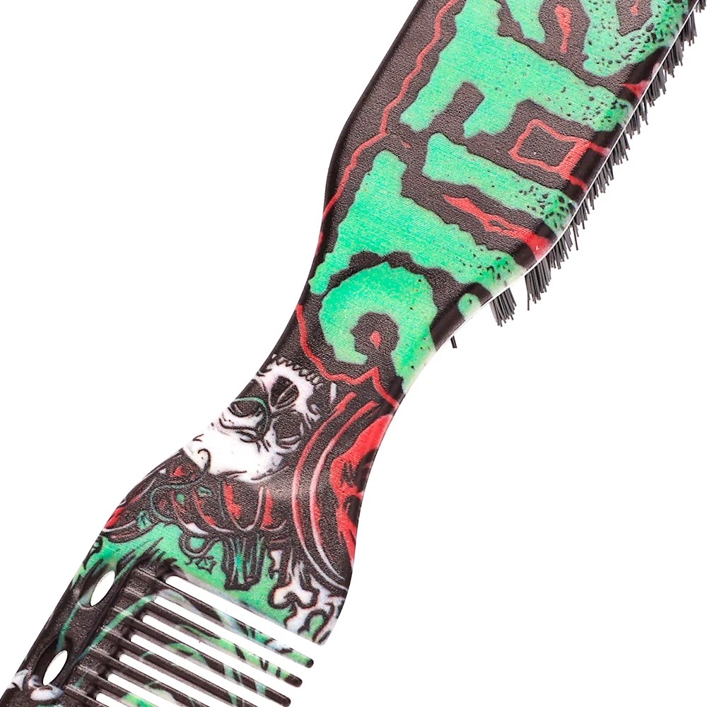 Praktický pomocník pre každodennú úpravu účesu aj starostlivosť o bradu, ktorý oceníte doma aj v profesionálnom barber salóne. Tento obojstranný nástroj kombinuje klasický hrebeň a kefu so štetinami, vďaka čomu umožňuje rýchle rozčesanie, uhladenie aj finálny styling. Ergonomické prevedenie zaisťuje pohodlné držanie a jednoduchú manipuláciu pri práci. Štýlová potlač dodáva hrebeňu moderný vzhľad a zároveň podčiarkuje jeho profesionálny charakter. Vďaka ľahkej konštrukcii je vhodný na každodenné použitie aj cestovanie.