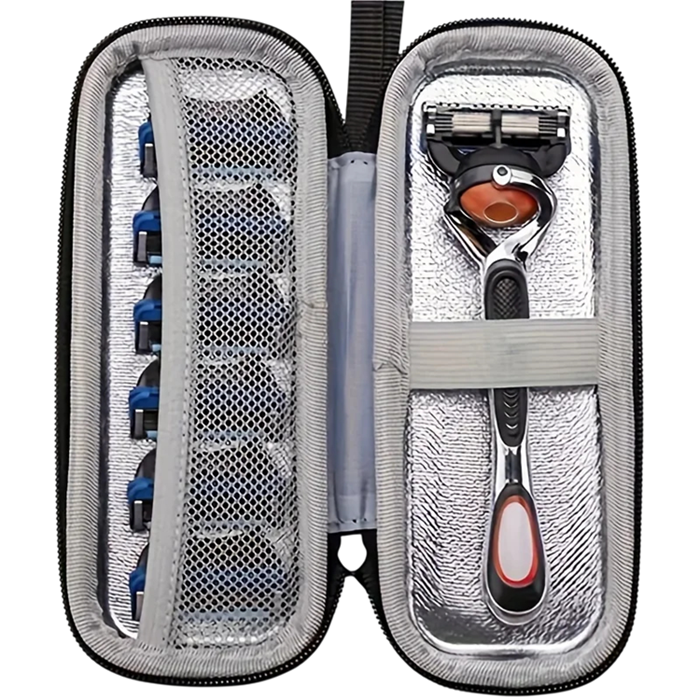 • Ochranné cestovné pouzdro na holící strojek a žiletku pre bezpečné skladovanie