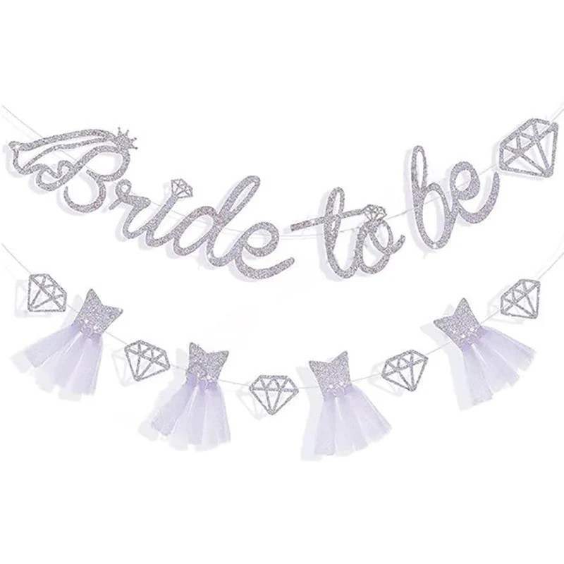 Tento trblietavý papierový banner s nápisom Bride To Be je výraznou dekoráciou na rozlúčku so slobodou alebo svadobnú oslavu. Nápis „Bride To Be“ znamená „Budúca nevesta“ a krásne zvýrazní hlavnú rolu oslavenkyne. Súčasťou girlandy sú tiež dekoratívne prvky v tvare diamantov a šiat, ktoré dodávajú celej výzdobe jemný a slávnostný vzhľad. Strieborný trblietavý efekt sa krásne leskne na svetle a pôsobí elegantne na fotografiách.