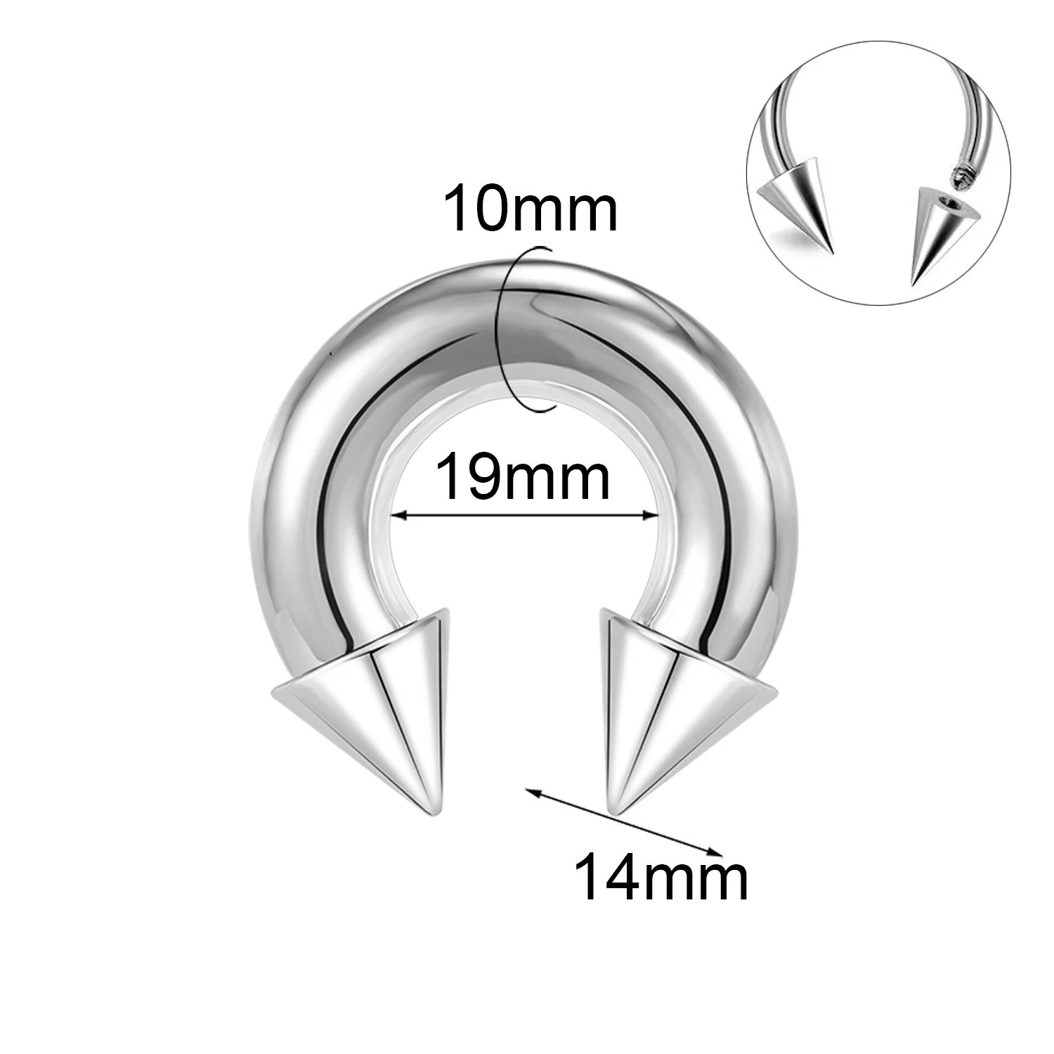 Extra masívny septum piercing z nerezovej ocele s podkovovitým tvarom a hrotmi, rozmery 10 x 19 x 14 mm pre maximálny výraz. Celý popis