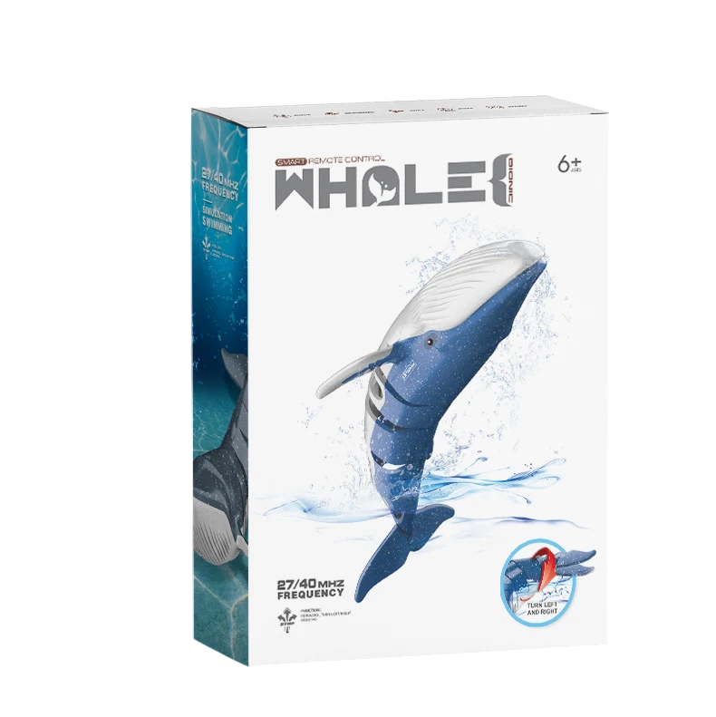 RC veľryba – podvodná ponorka na diaľkové ovládanie je jedinečná vodná hračka, ktorá kombinuje technológiu, zábavu a realistický dizajn inšpirovaný skutočnými morskými živočíchmi. Tento model o rozmeroch 20 × 9 × 3,5 cm je vybavený 2,4GHz ovládacím systémom, ktorý zabezpečuje stabilný signál a presné manévrovanie. Vďaka vodotesnej konštrukcii a schopnosti ponoru sa táto veľryba dokáže vynárať, potápať a dokonca striekať vodný stĺpec, čím napodobňuje správanie skutočnej veľryby.