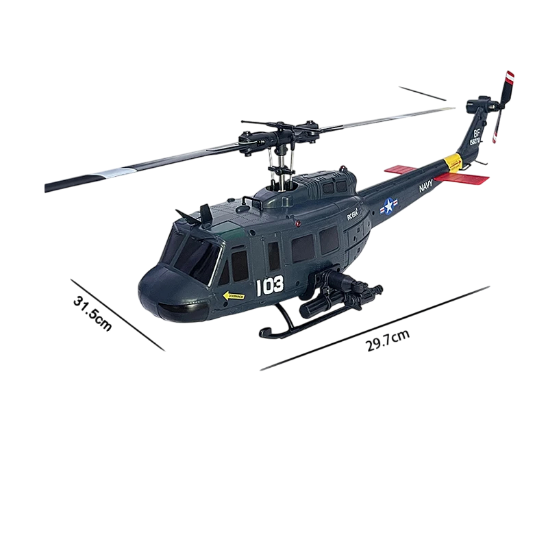 Vrtuľník má mierku 1:48 a priemer rotora 315 mm, čo z neho robí kompaktný, ale výkonný model vhodný na vnútorné aj vonkajšie lietanie. Vďaka frekvencii 2,4 GHz a šiestim kanálom (6CH) umožňuje plynulé ovládanie smeru, stúpania, klesania, otáčania aj stabilné vznášanie. Napájanie zabezpečuje lítijová batéria 7,4V 350mAh, ktorá poskytuje až 13 minút letu na jedno nabitie, zatiaľ čo dobíjanie cez USB nabíjačku trvá približne 70 minút.