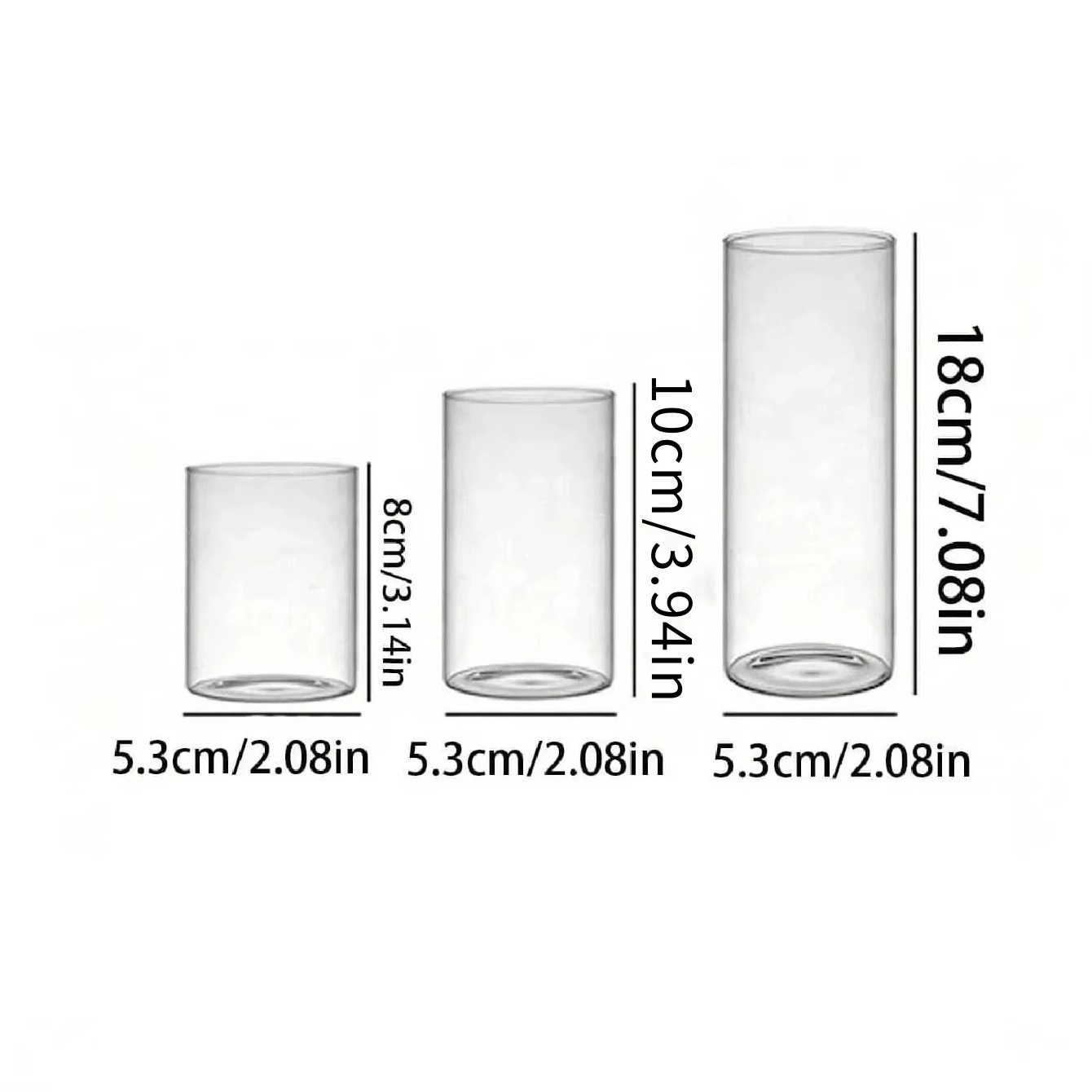 Sada 3 ks sklenenej valce na sviečky 5,3 x 8 / 10 / 18 cm Dekoratívne svietniky pre plávajúce sviečky Dekoratívna sada troch sklenených valcov je elegantným doplnkom pre vytváranie svetelných aranžmánov v interiéri. Valce majú rovnaký priemer a líšia sa výškou, čo umožňuje vytvoriť harmonickú a vyváženú dekoráciu. Sú vhodné na použitie s plávajúcimi sviečkami, dekoratívnymi kvetmi alebo inými aranžérskymi prvkami. Vďaka jednoduchému tvaru sa hodia do moderného aj klasického interiéru. Produkt slúži výhradne ako dekorácia.