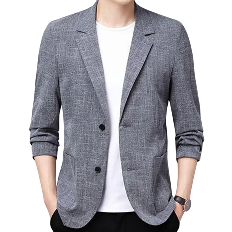 Šedé pánske sako z bavlny a lnu Elegantné priedušné sako pre mužov s vreckami a gombíkmi Štýlové jednofarebné sako pre každodenné aj formálne nosenie