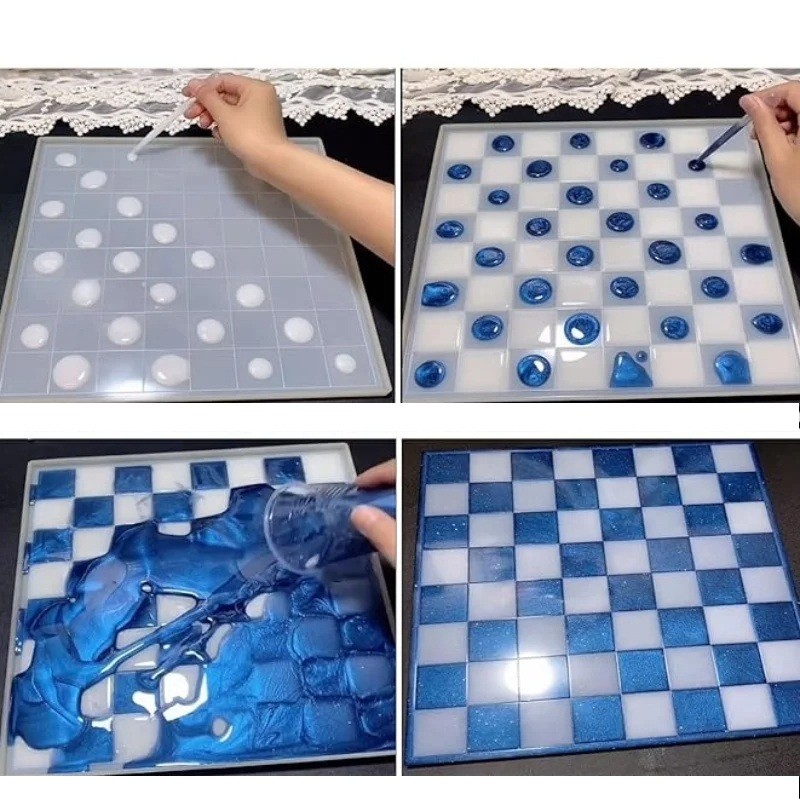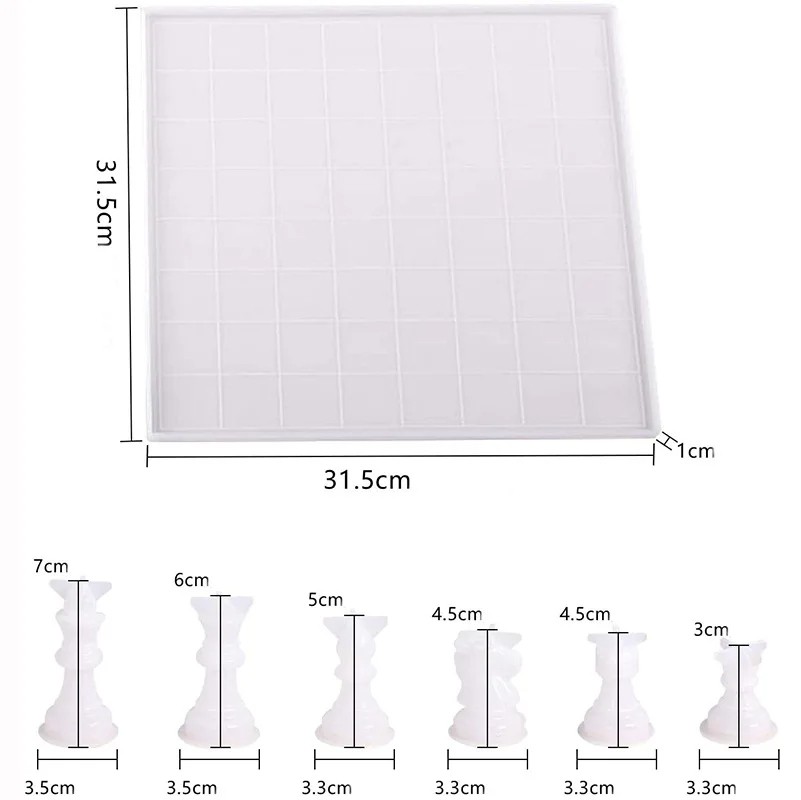 Táto sada prináša možnosť vyrobiť si kompletnú šachovú hru podľa vlastných predstáv. Obsahuje silikónové formy na odlievanie všetkých šachových figúriek aj formu na hraciu dosku o rozmeroch 31,5 x 31,5 cm. Využiť je možné živicu, farbivá, trblietky, sušené kvety alebo iné dekoračné materiály.