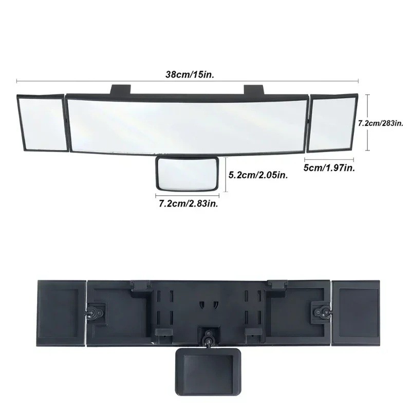 • Rozmery hlavného zrkadla sú 38 x 7 x 3 cm, bočné zrkadlá majú približne 7,2 x 7,2 cm a spodné zrkadlo pod hlavnou plochou cirka 7,2 x 5,2 cm – celé zrkadlo tak pokryje výrazne širší priestor než bežné originálne zrkadlo.
