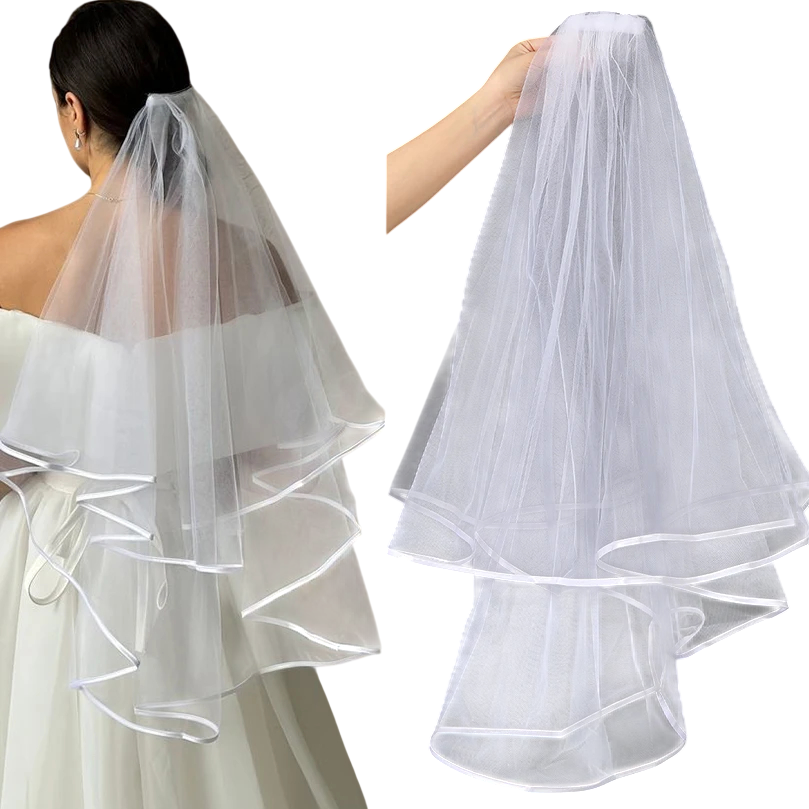 Biely dvouvrstvý tylový závoj s lemovaním a sponkou. Elegantný doplnok pre nevestu na svadbu aj oslavu. Celý popis