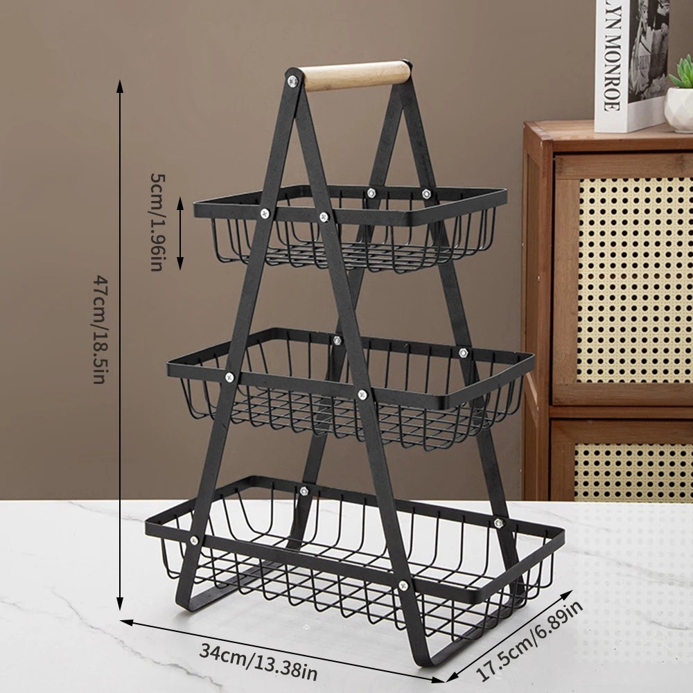 Rozmery 47 × 34 × 17,5 cm ponúkajú dostatok miesta pre uloženie ovocia, baleného občerstvenia alebo ďalších kuchynských zásob. Trojposchodové prevedenie uľahčuje rozdelenie jednotlivých potravín podľa typu alebo veľkosti, čo prispieva k lepšej organizácii. Na hornej časti je umiestnená rukoväť na prenášanie, ktorá zjednodušuje manipuláciu pri presúvaní stojanu. Tento úložný košík je možné využiť nielen na skladovanie, ale aj ako stojan na servírovanie drobného občerstvenia. Jeho usporiadanie pomáha udržať pracovnú plochu prehľadnejšiu a lepšie organizovanú.